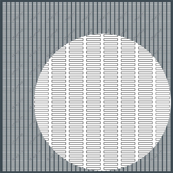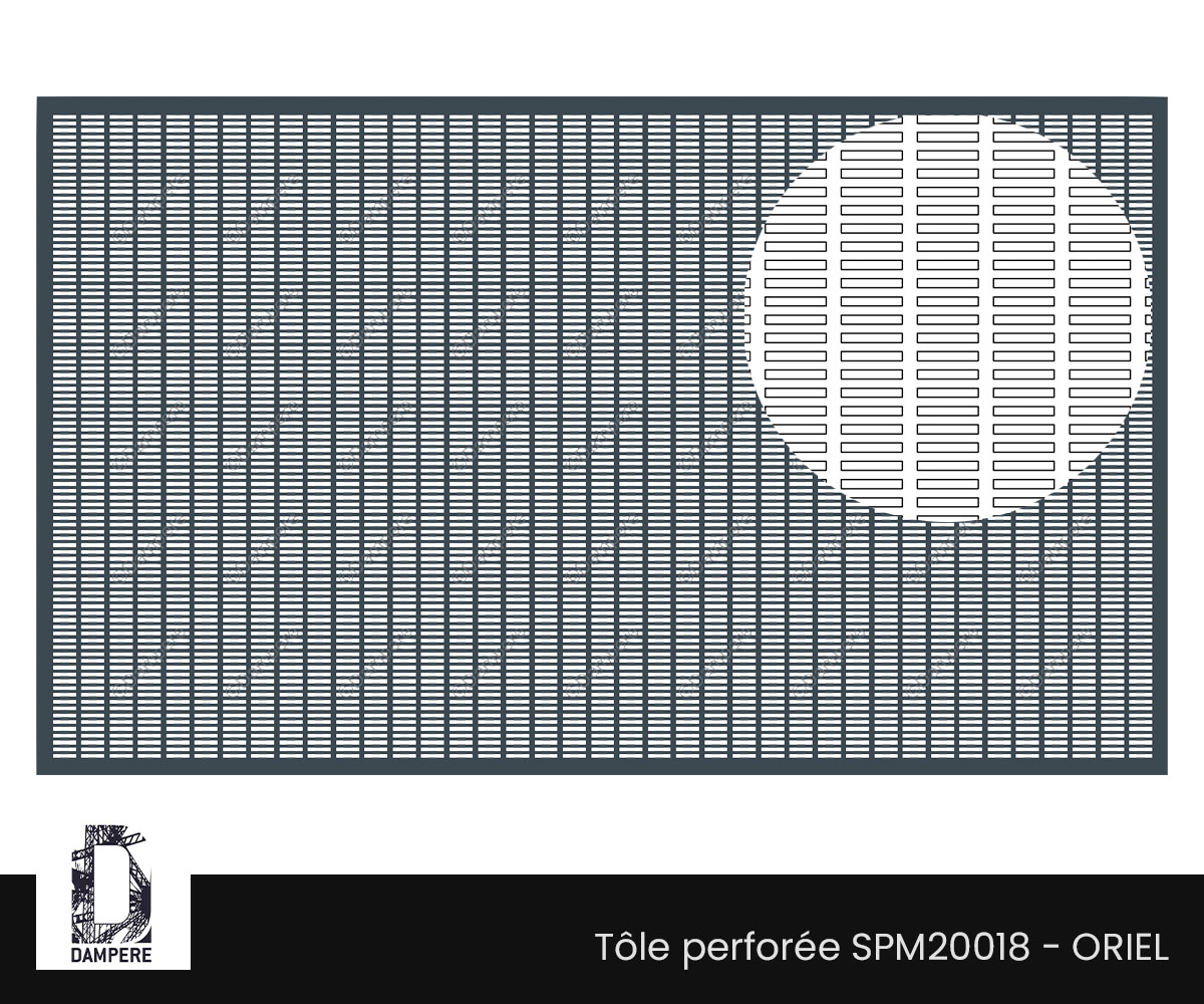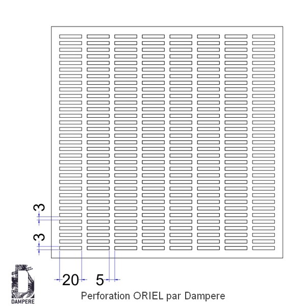Tôle perforée décorative composée de petits trous rectangulaires filiformes, alignés verticalement et horizontalement pour réaliser une claire-voie homogène.
