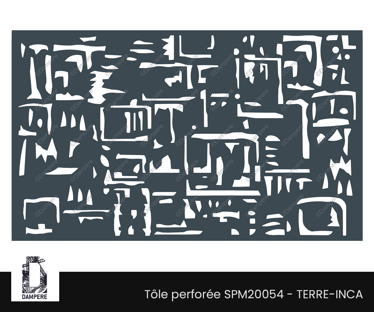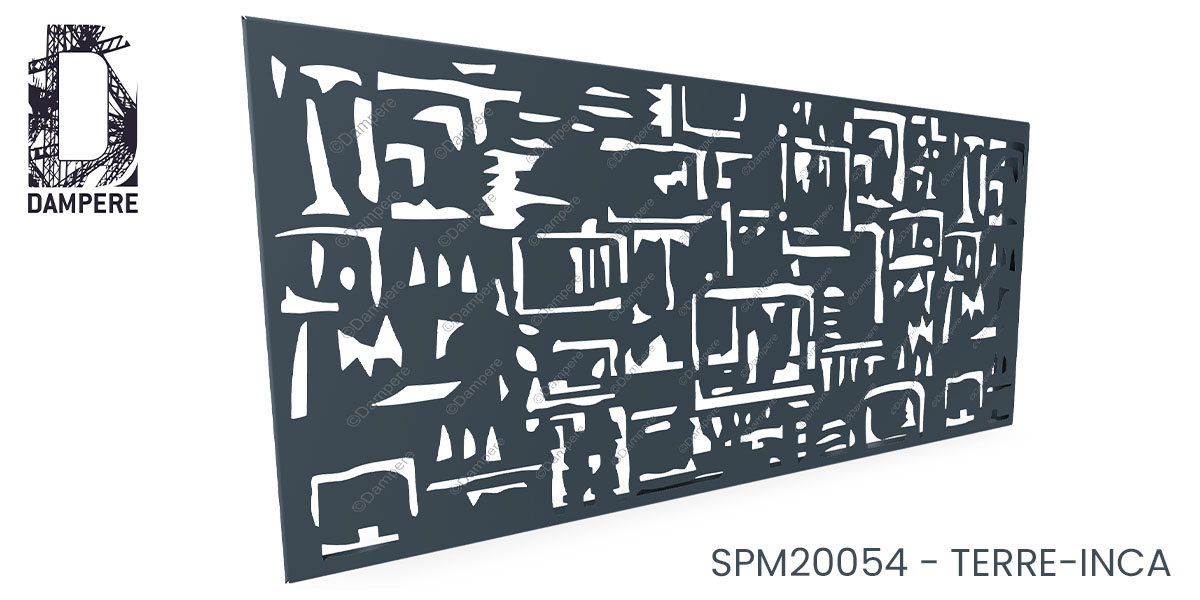 Tôle décorative Terre Inca sollicite des ouvertures pointues, ciselées et entaillées dans le métal, produit une symbolique scripturale et esthétique dans la répétition de formes simples. Esthétique en lien avec une écriture ancienne et des dessins tribaux découpés au laser.