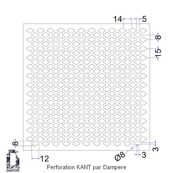 Tôle perforée Kant composée de croisillons en diagonale chargés de bulbes ovalisés à chacune de ses extrémités. Le motif représentant des traits qui constituent une résille ondulée qui arrondi les croisillons interstitiels.
