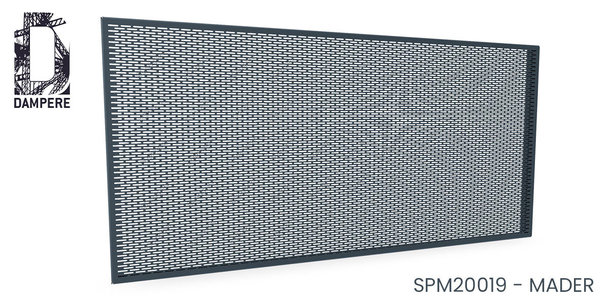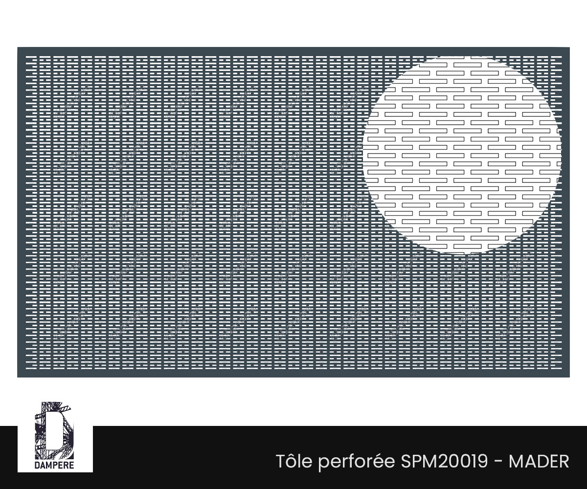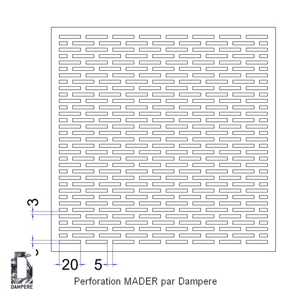 Tôle perforée MADER à trous rectangulaires de petite taille disposés en quinconce, donne une grille aux formes fines et élancées qui arrête les insectes et réduit les vues latérales tout en conservant un passage d'air confortable.