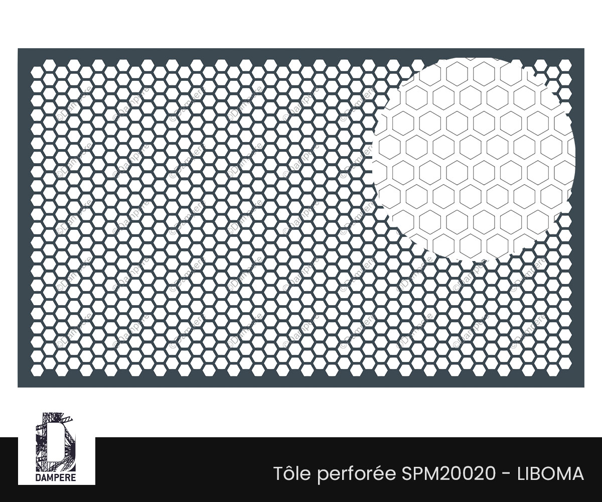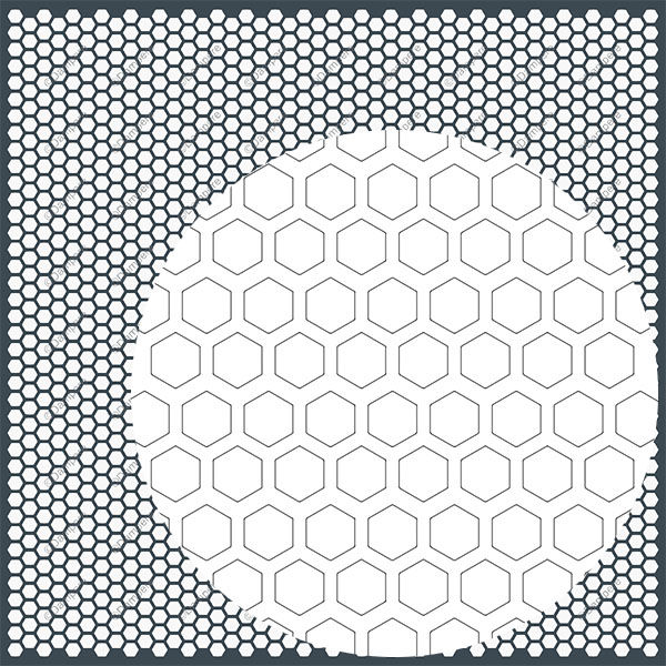 Tôle perforée en nid d'abeille régulier, composée de trous hexagonaux répartis de manière homogène sur la surface du panneau. Espacement entre les trous en diagonale de 60° pour améliorer le taux de transparence.