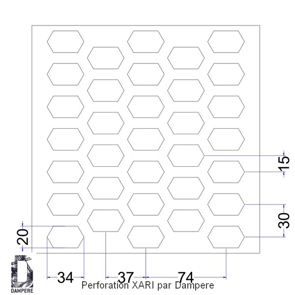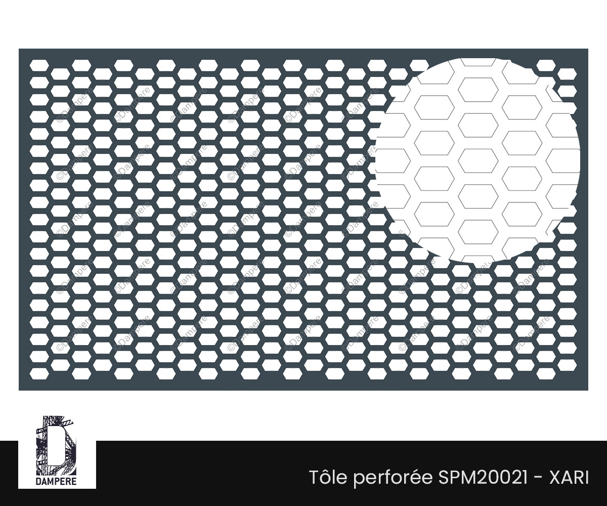 Tôle perforée XARI à trous hexagonaux allongés pour former des vides de grande taille, dispositions des perforation en quinconce.