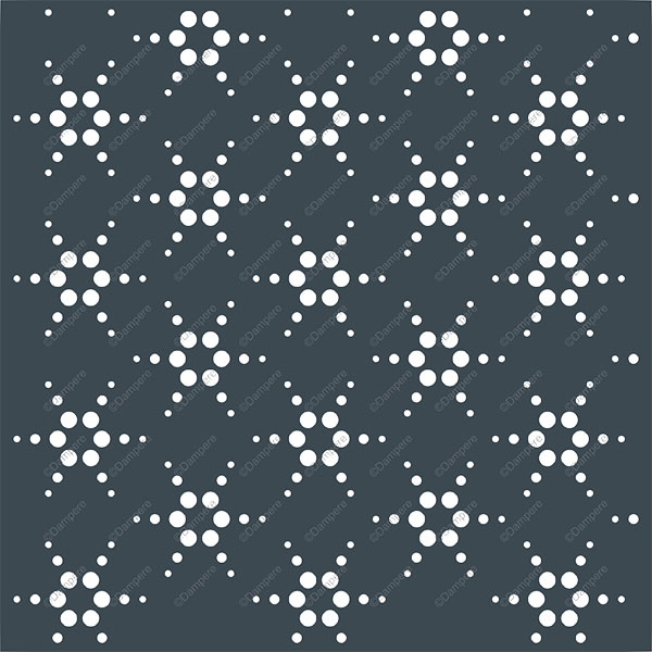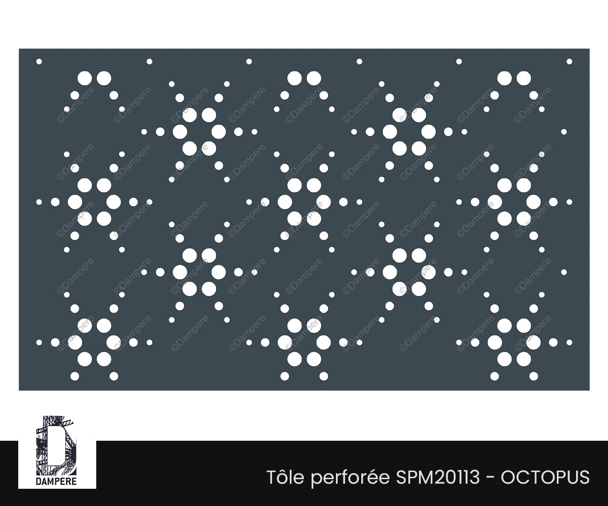 La tôle perforée décorative Octopus présente un motif floral géométrisé, composé d’un thème régulier de trous ronds de différents diamètres, habilement disposés en étoiles à six branches. Chaque étoile est formée de 18 perforations – un cercle central entouré de six satellites – évoquant le cœur d’un motif floral stylisé d’une grande lisibilité graphique. Ce design perforé à la fois minimaliste et répétitif offre une lecture élégante et équilibrée de la surface de la plaque d’acier occultante.