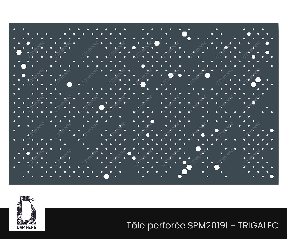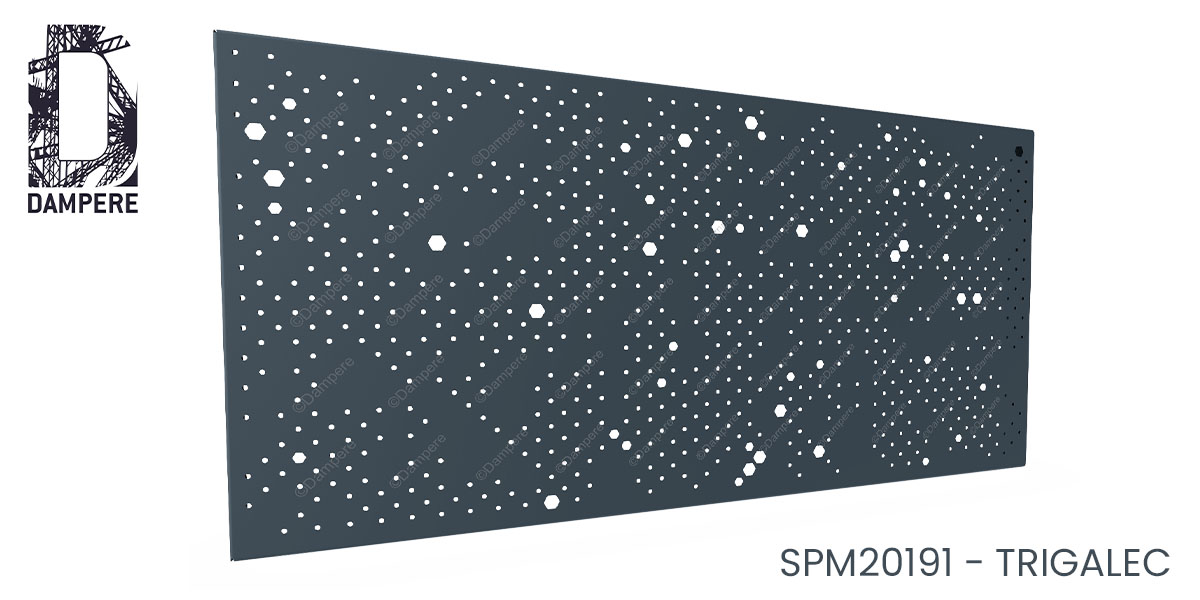 En tenant compte de son faible taux de transparence à 13 % qui privilégie l’occultation et la confidentialité, la perforation Trigalec est polyvalente, pensée pour les usages où l'opacité est recherchée sans renoncer à la lumière ni au détail graphique. Le décor en acier s’impose comme une alternative design à la tôle pleine, offrant à la fois protection visuelle et élégance textile. Le motif Trigalec devient un allié précieux dans les aménagements intérieurs où l’on cherche à séparer sans cloisonner. Sa trame dense protège des regards directs tout en laissant filtrer une lumière douce, grâce aux perforations fines qui diffusent un éclairage tamisé. Avec sa faible transparence, la tôle perforée Trigalec est parfaite pour les jardins urbains ou les zones mitoyennes où l’occultation est essentielle. Le voile occultant assure une barrière visuelle discrète sans recourir à un mur opaque et permet une lecture continue du décor sans cassure grâce à son motif homogène. Mais le panneau occultant Trigalec répond aussi aux exigences de sécurité, d’intimité et d’esthétique dans le logement collectif. Son motif protège les usagers des vues plongeantes depuis la rue tout en limitant l’exposition directe au soleil, grâce à son taux de vide modéré. Ce type de remplissage permet également de réduire le ressenti de vide pour les enfants et personnes sensibles à la hauteur. La barrière d'occultation Trigalec permet de camoufler efficacement des volumes techniques (groupe de climatisation, coffrage, gaines techniques) tout en assurant une ventilation suffisante. Son ajourage serré filtre les vues sans bloquer totalement les flux d’air, ce qui en fait une solution idéale pour les modules en toiture ou les enveloppes techniques visibles depuis l’espace public. Esthétiquement, la finesse du dessin perforé permet d’apporter une finition soignée et uniforme, remplaçant les grilles fonctionnelles classiques par un bardage à haute valeur architecturale.