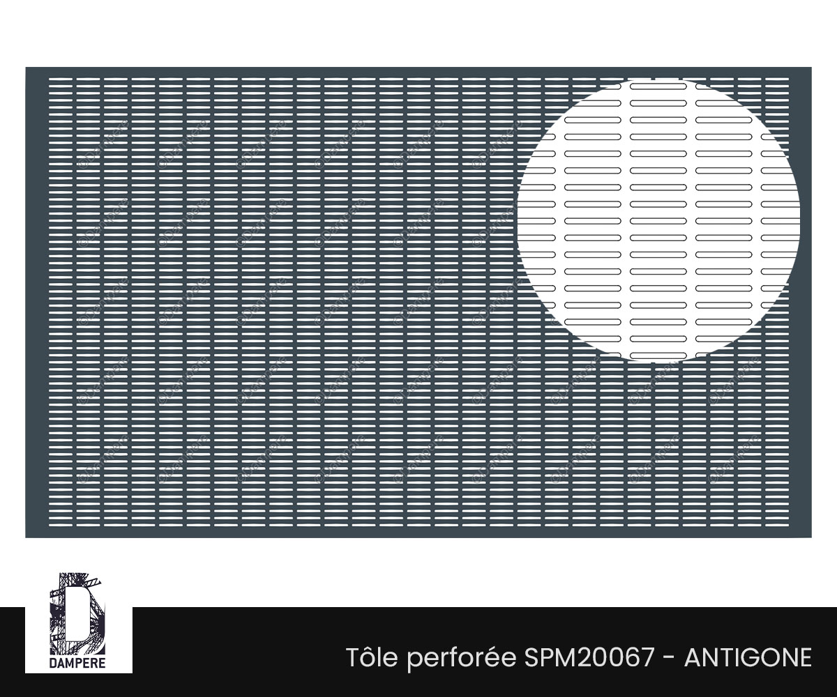La tôle perforée pour ventilation Antigone de DAMPERE s'utilise principalement en grille de protection, en grille de cache radiateur, en support de soufflerie ou en composant de ventilation. Cette perforation protège en milieu urbain car la finesse des trous évite le passage de déchets ou de mégots de cigarettes.