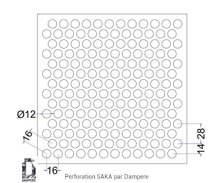 Tôle perforée R12T16 - SAKA à trou rond de 12 mm disposition en quinconce pour former une grille perforée Rv12-16 à transparence 51% de vide