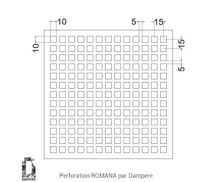 La tôle perforée Romana – C10U15 propose une lecture fine et régulière, idéale quand on recherche une transparence modérée associée à une bonne tenue mécanique. La perforation est constituée de trous carrés de 10 mm de côté, disposés en alignement orthogonal sur un pas régulier de 15 mm entre les trous. Modèle standard, référencé Qg10-15, le motif développe un taux de transparence d’environ 44 % ( 100 mm² d’ouverture pour 225 mm² de maille), un équilibre pertinent pour filtrer la lumière, ventiler sans surexposer et offrir une perception visuelle plus apaisée que les grandes ouvertures.