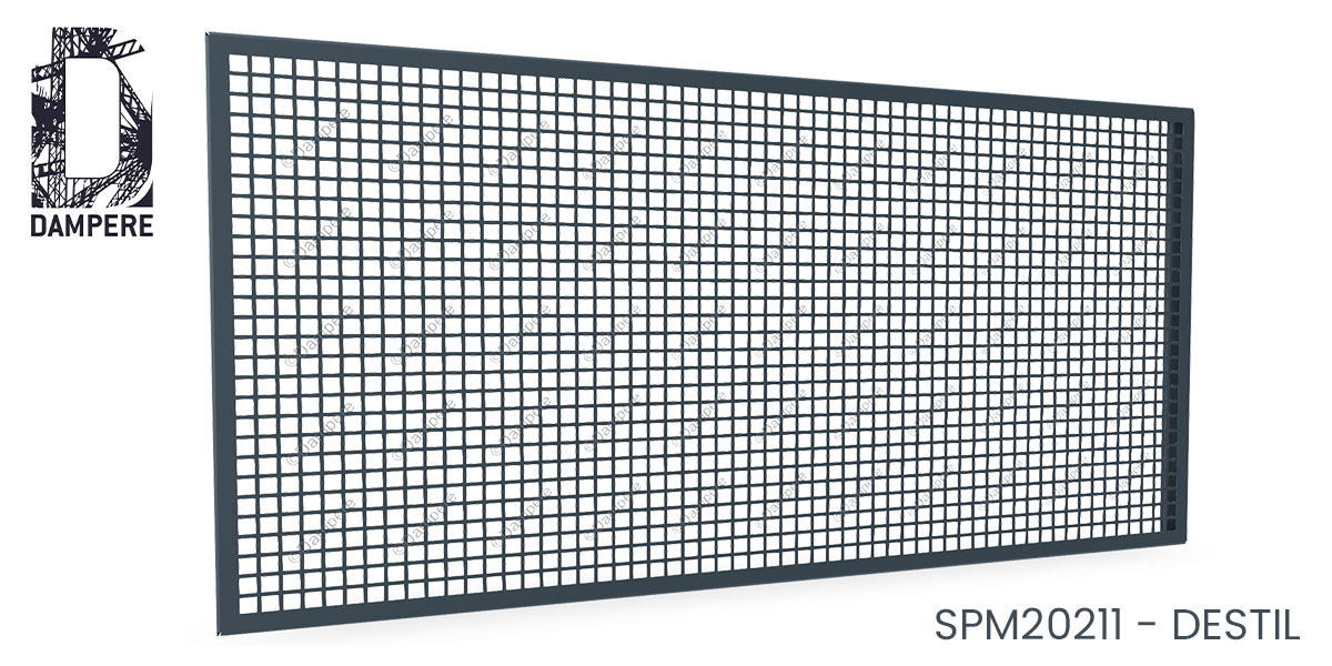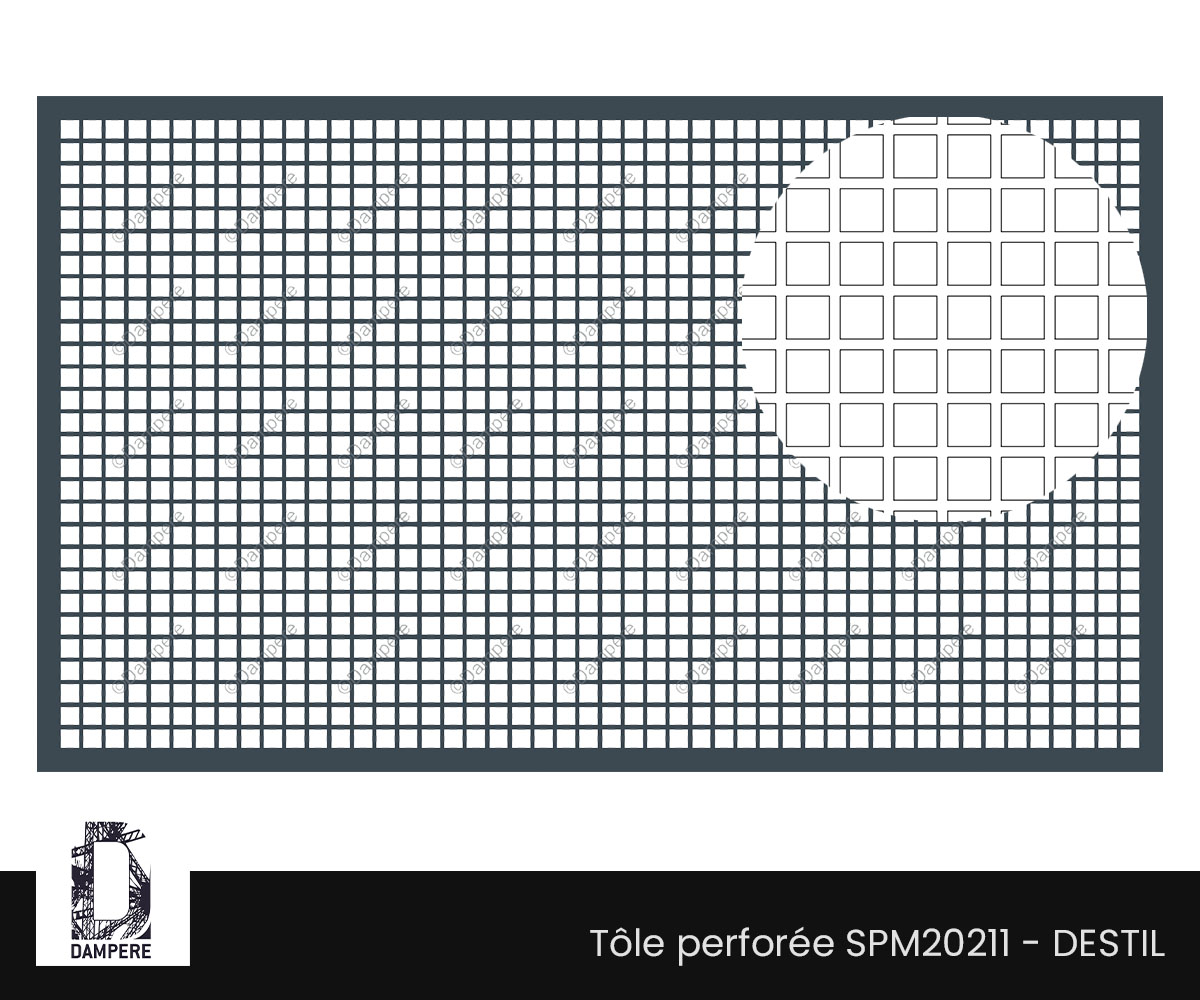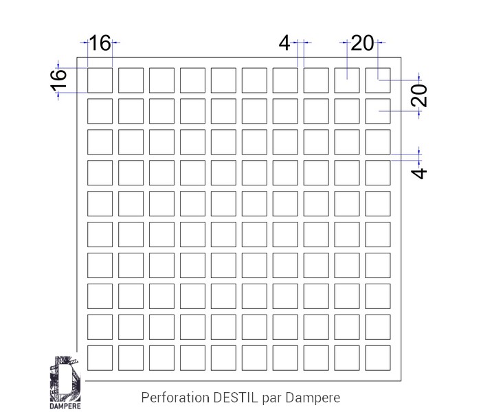 La tôle perforée C16U20 – Destil marque l’espace par son graphisme fort et sa régularité extrême. Composée de trous carrés de 16 mm de côté, alignés selon une trame orthogonale régulière, espacés de 20 mm d’axe à axe, elle forme une grille métallique standard désignée Qg16-20, offrant une transparence remarquable de 64 %. Cette alternance de vide et de matière donne lieu à un motif géométrique puissant, idéal pour des projets où la lumière, l’air et la forme sont pleinement exploités. L’aspect orthogonal est une composante importante du design de la tôle perforée.