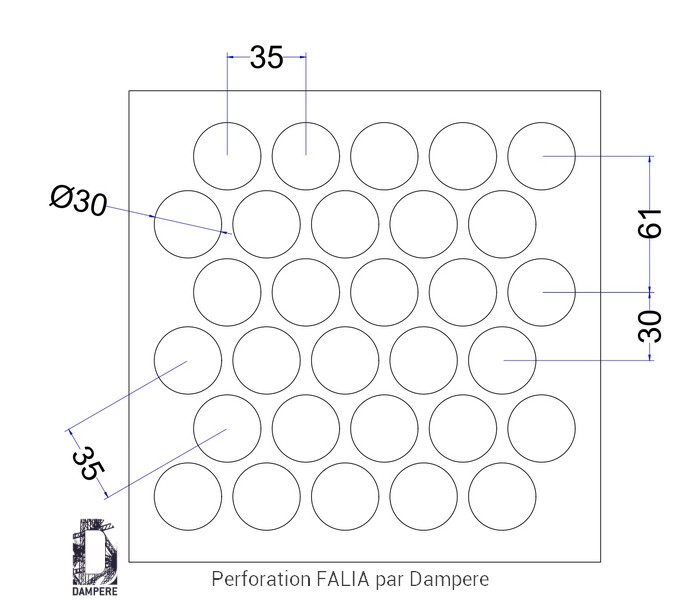 La tôle perforée Falia – R30T35 revendique une esthétique très ouverte et lumineuse : des disques de diamètre Ø 30 mm disposés en quinconce sur un pas de 35 mm. Référencée selon la norme de perforation Rv30-35, cette géométrie ajourée offre une transparence d’environ 66 % (≈ 706,9 mm² d’ouverture pour ≈ 1 061,9 mm² de maille), idéale quand la priorité va aux forts débits d’air, à la diffusion de lumière et à l’allègement visuel d’enveloppes techniques. La trame perforée en quinconce répartit les ajours de façon isotrope : les ombres sont moirées, douces et peu directionnelles ; à grande distance, la peau se lit comme un voile homogène et très respirant.