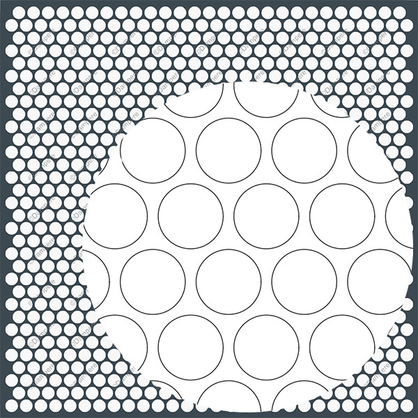 La tôle perforée R30T35 – Falia se distingue par son ouverture généreuse et la pureté de sa géométrie circulaire. Avec ses grands trous ronds perforés de diamètre 30 mm disposés en quinconce et un taux de vide d’environ 66 %, elle compose une grille extrêmement respirante, légère et transparente, avec l'un des taux de perforation maximal pour l'architecture.