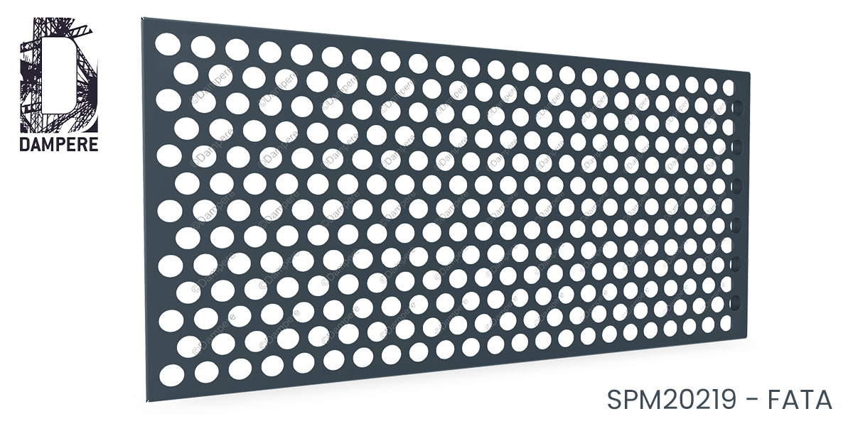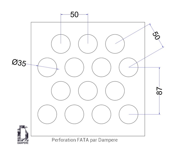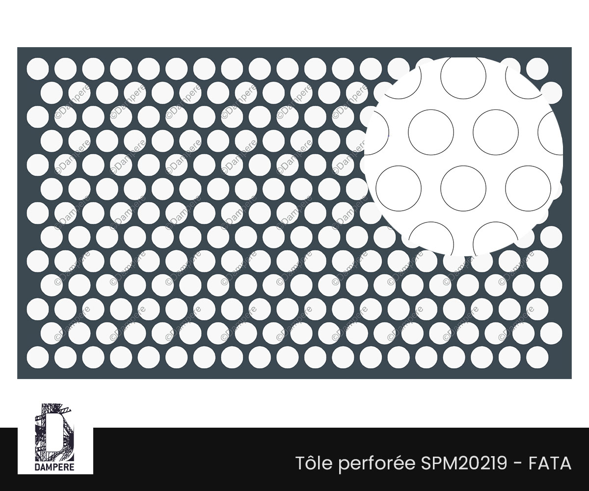 La tôle perforée Fata – R35T50 assume une esthétique énergique et très respirante : de grands disques Ø 35 mm disposés en quinconce sur un pas régulier de 50 mm.