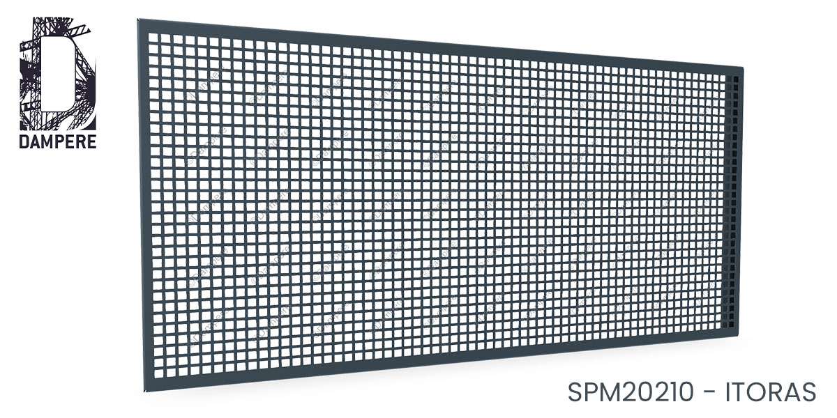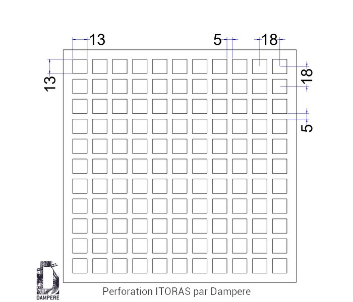 La tôle perforée C13U18 – Itoras allie structure géométrique affirmée, bonne transparence et tenue mécanique suffisante. Son motif ajouré est composé de trous carrés de 13 mm, régulièrement alignés selon une trame orthogonale avec un entraxe de 18 mm, créant ainsi une grille standard carrée Qg13-18. La perforation offre un taux d’ouverture de 52 %, équilibré entre passage d’air, lumière et matière.