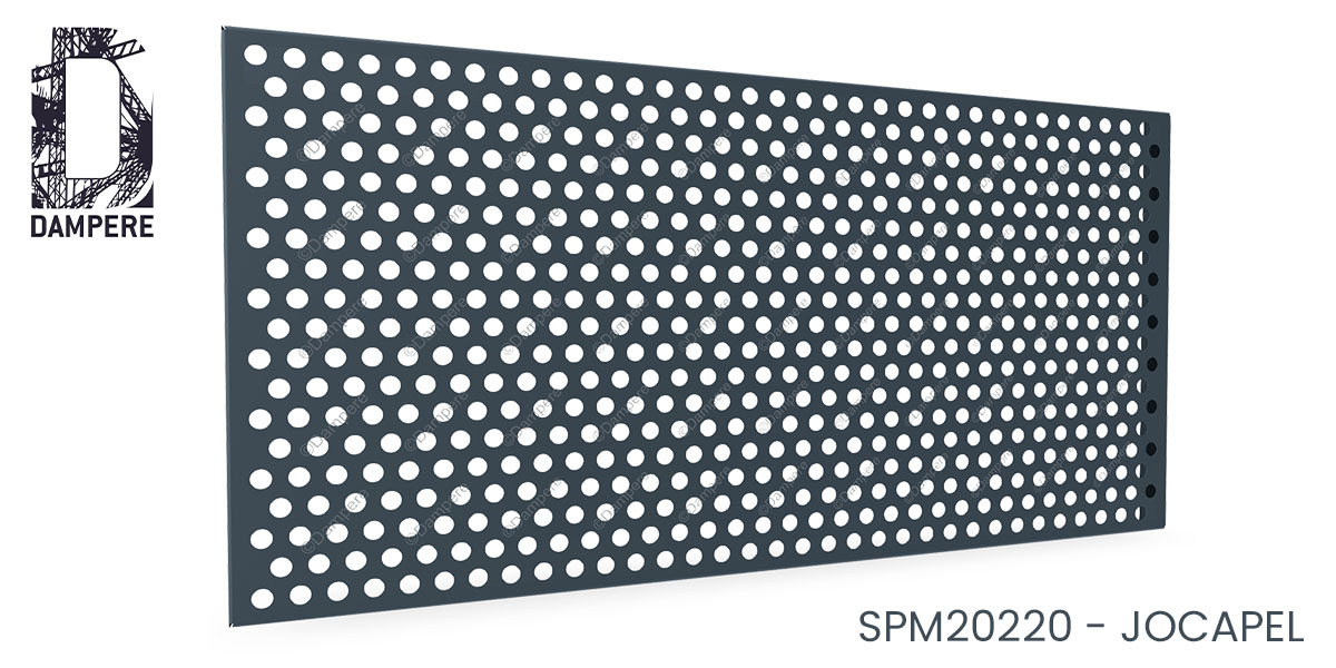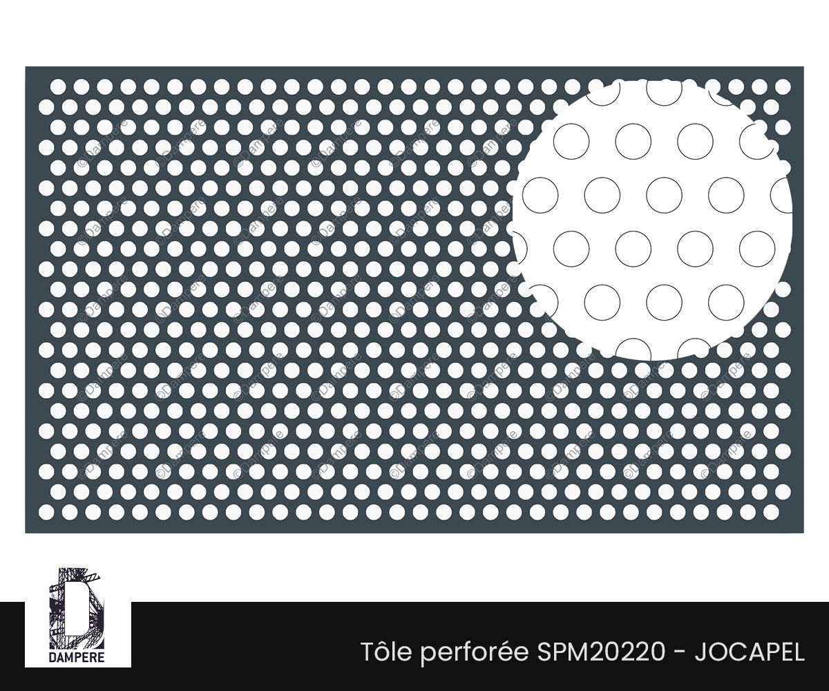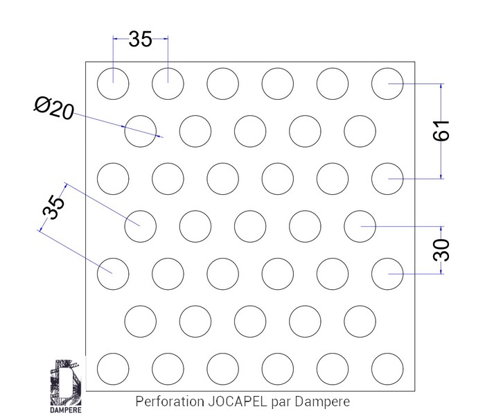 La tôle perforée R20T35 Jocapel propose une signature visuelle aérée mais mesurée : des ronds percés de diamètre Ø 20 mm agencés en quinconce sur un pas constant de 35 mm. Désignation normalisée Rv20-35, cette géométrie de perfo délivre environ 25 % de vide, un ratio pertinent quand l’objectif est d’assurer un passage d’air utile, une transmission lumineuse confortable et un allègement perceptible de l’enveloppe du bâtiment sans basculer dans la transparence élevée.