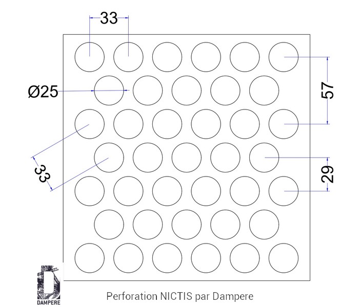 La tôle perforée R25T33 Nictis revendique une esthétique très ouverte et lumineuse : des ronds perforés de diamètre Ø 25 mm disposés en quinconce sur un pas régulier de 33 mm. Référencée par nomenclature Rv25-33, cette géométrie perforée offre une transparence supérieure à 52 %, idéale lorsque la priorité va aux forts débits d’air, à la diffusion généreuse de lumière et à l’allègement visuel des enveloppes techniques. La trame en quinconce répartit les ajours de façon isotrope : les ombres sont moirées, douces et peu directionnelles ; à distance, la peau se lit comme un voile homogène et très respirant, une résille métallique discrète.
