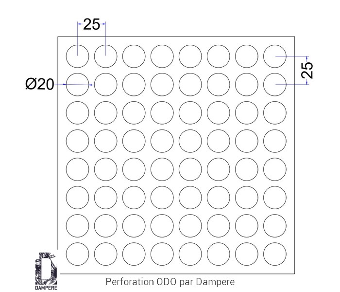 La tôle perforée R20U25 Odo propose une écriture visuelle franche et lumineuse : des ronds de Ø 20 mm agencés en alignement orthogonal sur un pas constant de 25 mm. Sous la désignation normalisée de perforation Rg20-25, cette géométrie de perfo délivre plus de 50 % de vide, un niveau élevé lorsque l’objectif est d’assurer un fort passage d’air, une transmission lumineuse généreuse et un allègement perceptible de l’enveloppe métallique. À la différence d’une tôle peforée RxTy, la grille perforée orthogonale produit une répartition directionnelle des ouvertures : les ombres dessinent un quadrillage régulier, avec un effet barreaux plus lisible selon l’orientation ; à distance, la surface se perçoit comme un voile métallique très respirant.