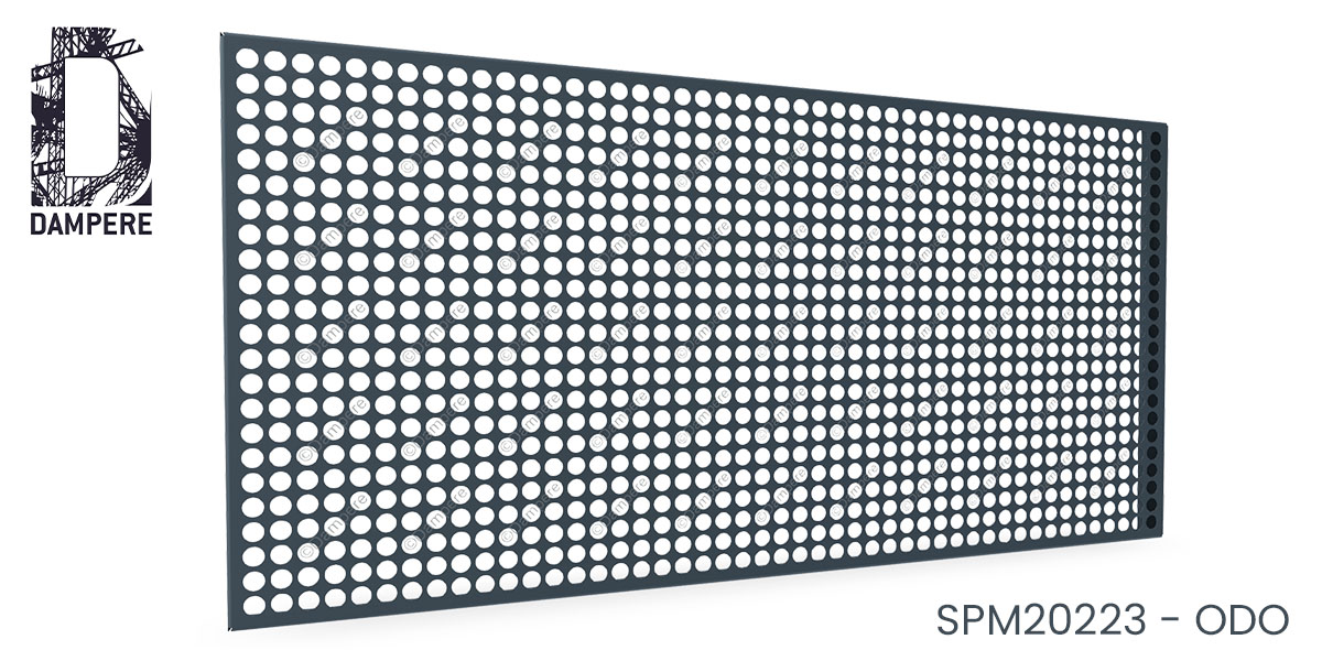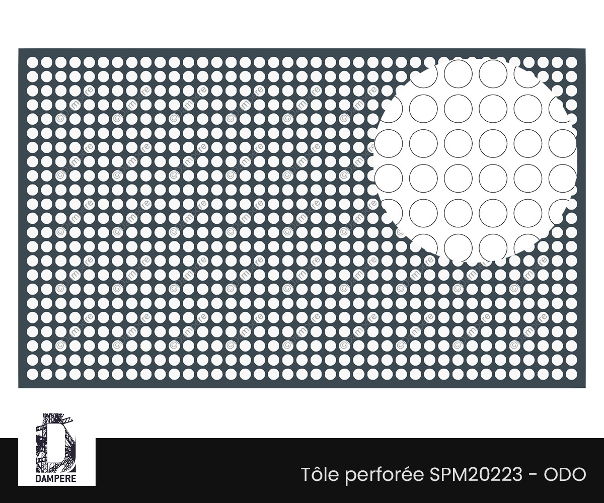 Le trou rond de diamètre Ø 20 mm offre une présence graphique nette, modulable par la couleur : rendu plus discret sur teintes sombres, plus affirmé sur finitions claires ou métalliques. Le motif se prête aux façades ventilées, écrans d’espaces techniques, masques d’unités CVC, parements rapportés et habillages de parkings à aération naturelle quand la ventilation prime, tout en assumant un masquage limité de l’arrière-plan. En architecture, l’orientation de la trame (horizontale/verticale) permet d’ajuster la lecture visuelle et les effets d’ombre.