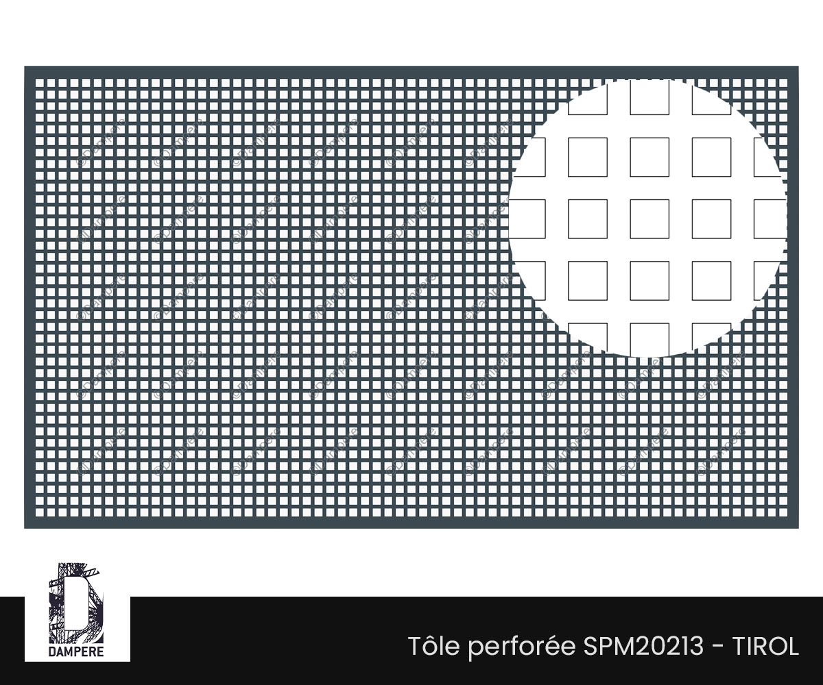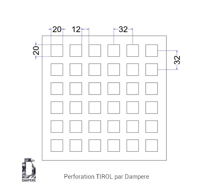 La tôle perforée C20U32 – Tirol s’impose par son dessin rigoureux, sa tenue mécanique solide et sa grille visuelle nette. Elle est composée de trous carrés de 20 mm de côté, disposés selon un alignement orthogonal à entraxe régulier de 32 mm. Ce motif standard, référencé Qg20-32, affiche un taux de transparence de 39 %, parfaitement équilibré pour offrir respiration, sécurité et stabilité dans une même tôle.
