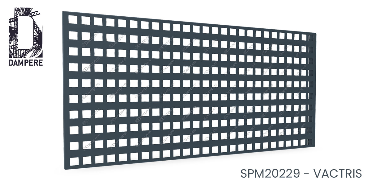 Là où les grilles fines filtrent, la plaque Vactris bloque. Elle trace une limite, affirme un périmètre, impose une frontalité. Ce motif ajouré assume une fonction défensive, tout en préservant une ventilation utile – idéale pour les façades de machineries, les enveloppes de parkings sécurisés, les masques de zones techniques. La faible ouverture en fait un matériau de dissimulation, apte à contenir ce qu’il abrite sans le montrer.