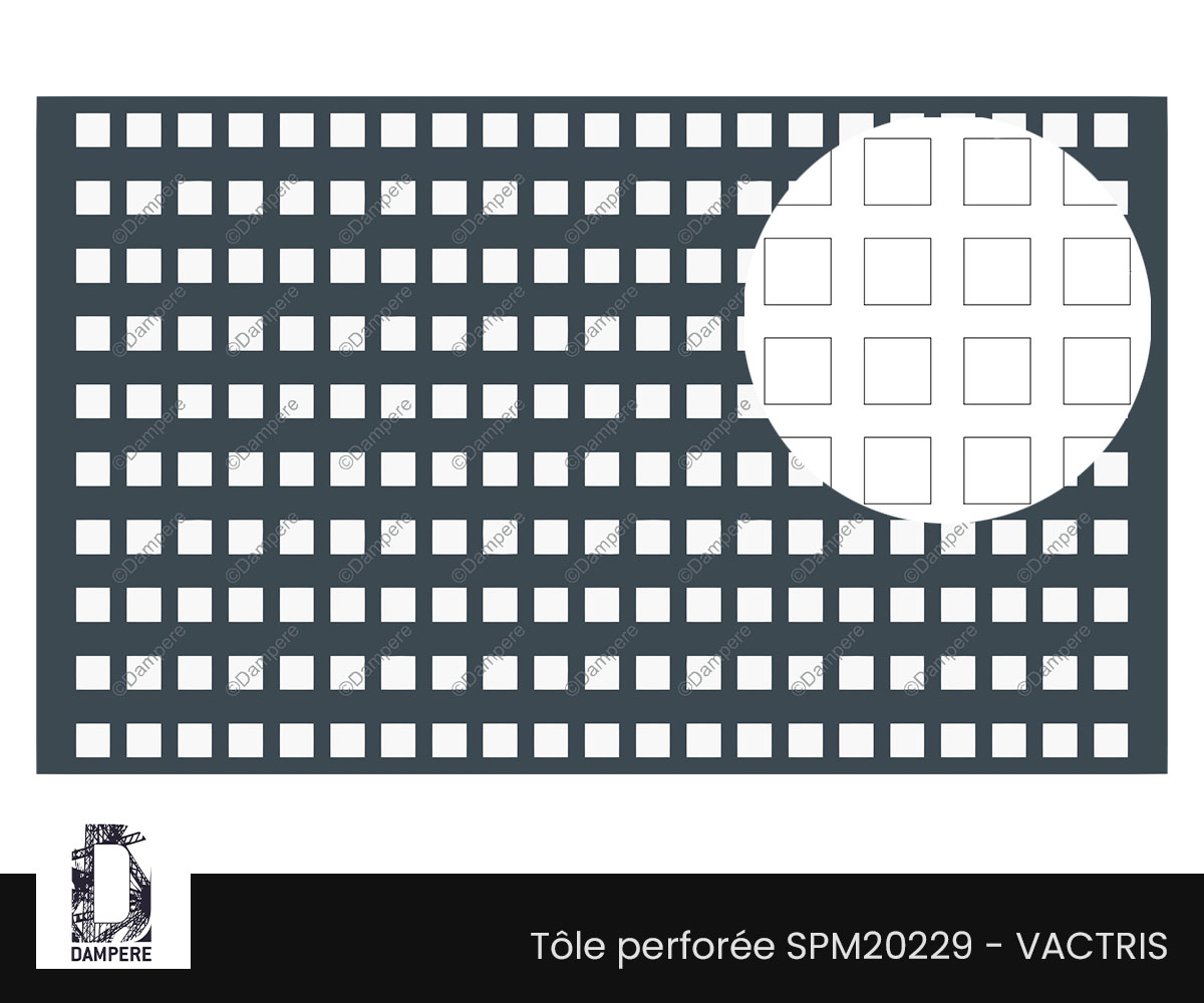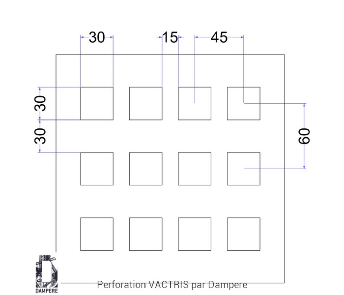 La tôle perforée Vactris – C30U45x60 affirme une esthétique puissante : de grands carrés de 30 mm alignés en trame orthogonale, sur un pas de 45 mm à l’horizontale et 60 mm à la verticale. Cette géométrie régulière de DAMPERE compose un langage visuel sobre et massif, idéal lorsque l’objectif est de filtrer la vue tout en conservant une perception graphique nette. Référencé Qg30–45×60, le motif offre une transparence d’environ 15 %.